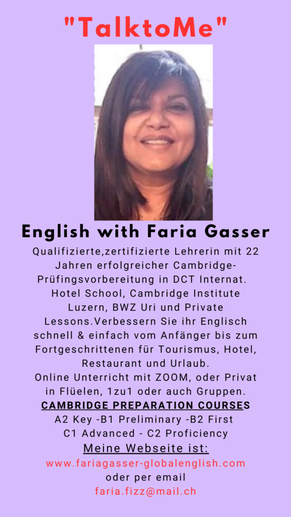 “TalktoMe” English with Faria Gasser Qualifizierte, zertifizierte Lehrerin mit 20 Jahren erfolgreicher Cambridge-Prüfungsvorbereitung. Unterrichtet derzeitig... Read More