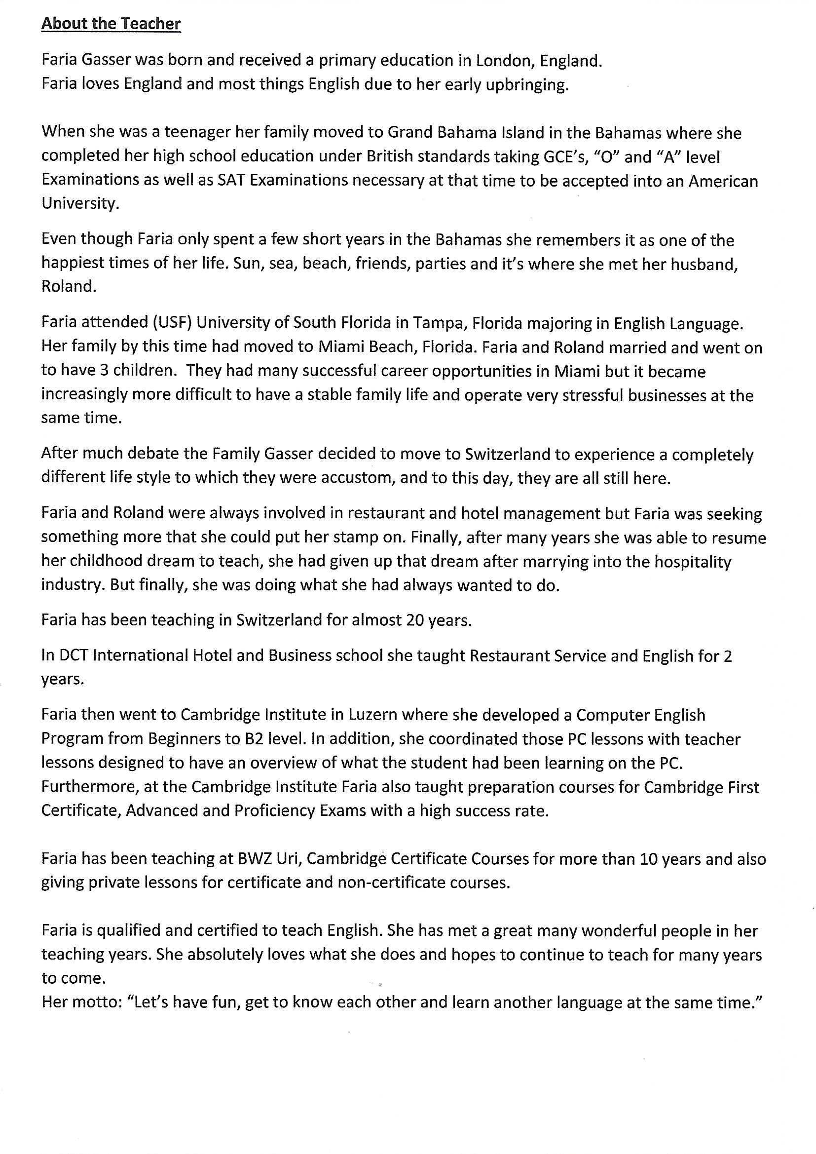 Faria Gasser’s Course Advertisement